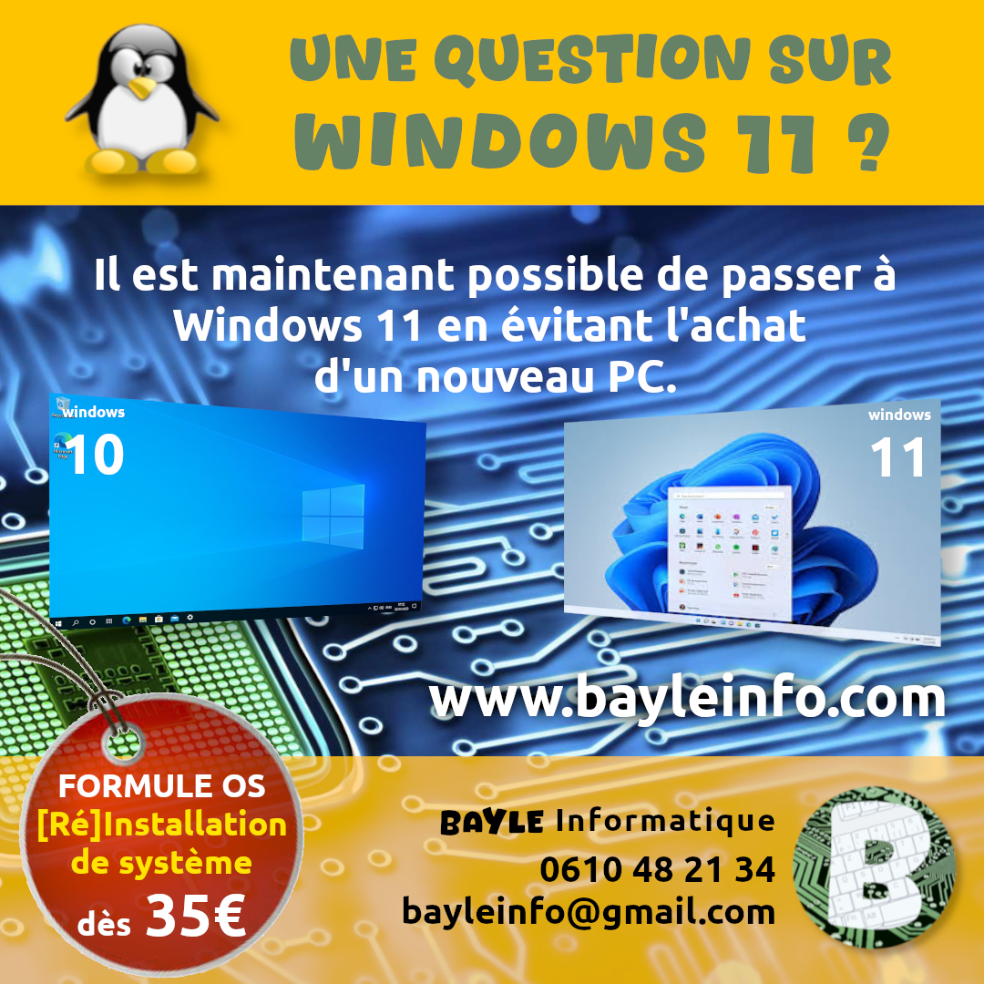 Il est aujourd’hui possible de passer à Windows 11 en évitant l’achat d’un nouveau PC. Microsoft a annoncé la fin du support de Windows 10 en octobre 2025. Il sera toujours possible d’utiliser votre PC mais sans mises à jours fournies. Microsoft a réduit le nombre de machines compatibles avec sa 11ème version pour essayerLire la suite « Passer à Windows 11 ? »